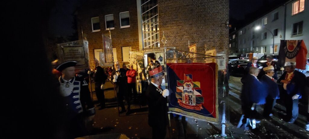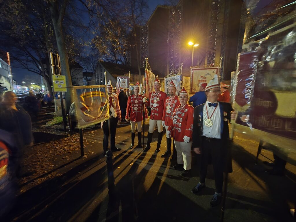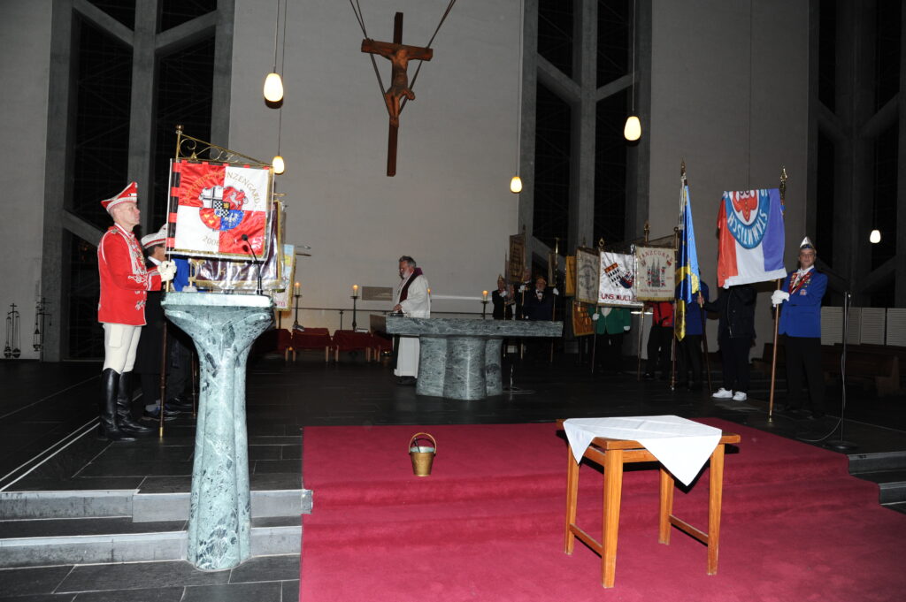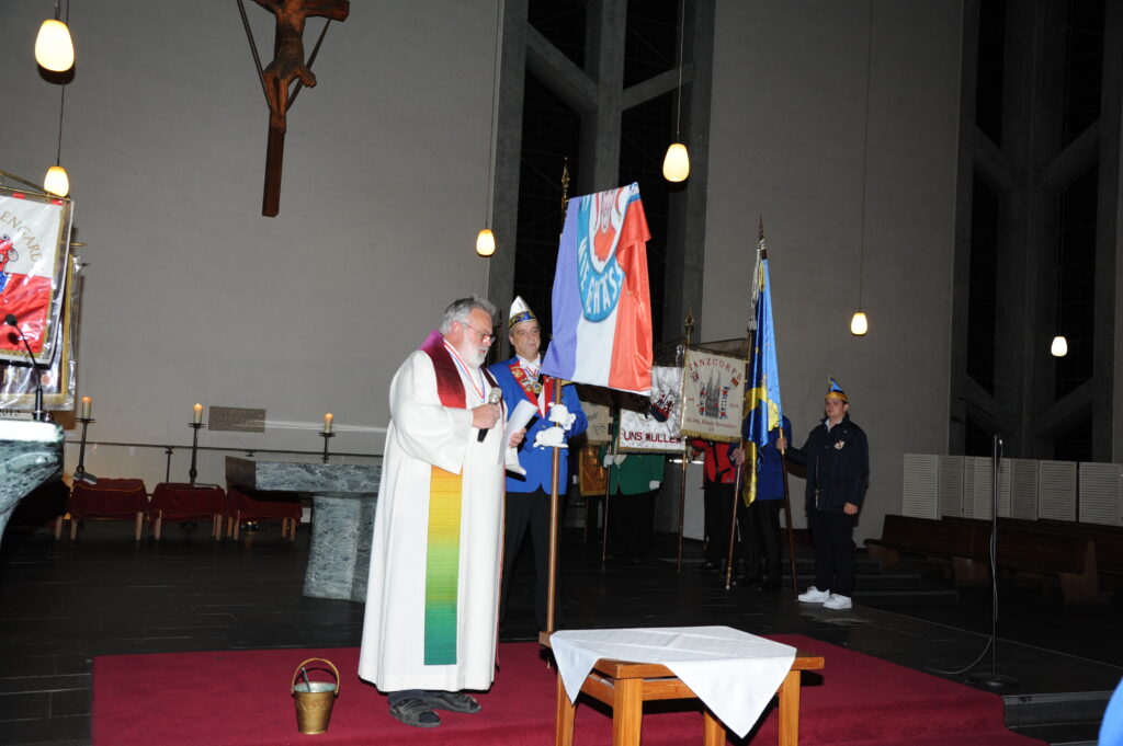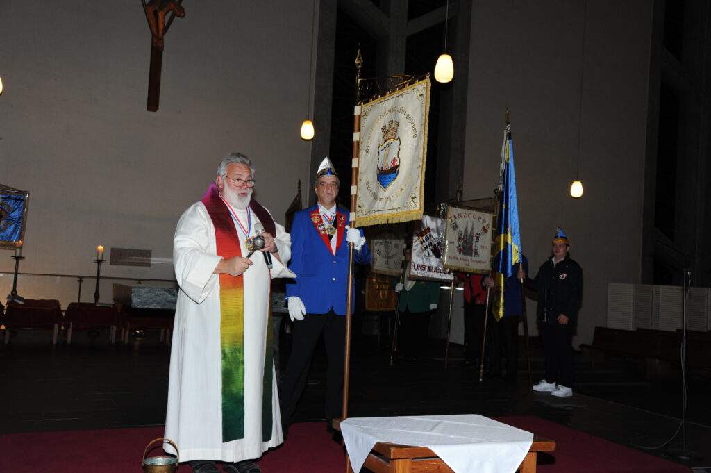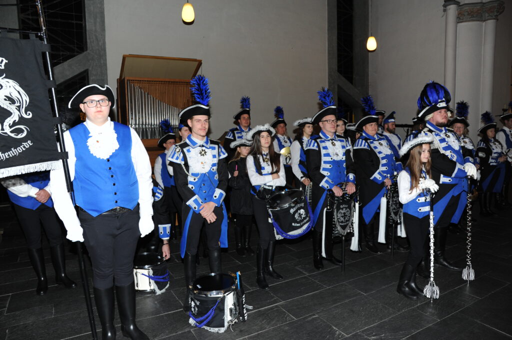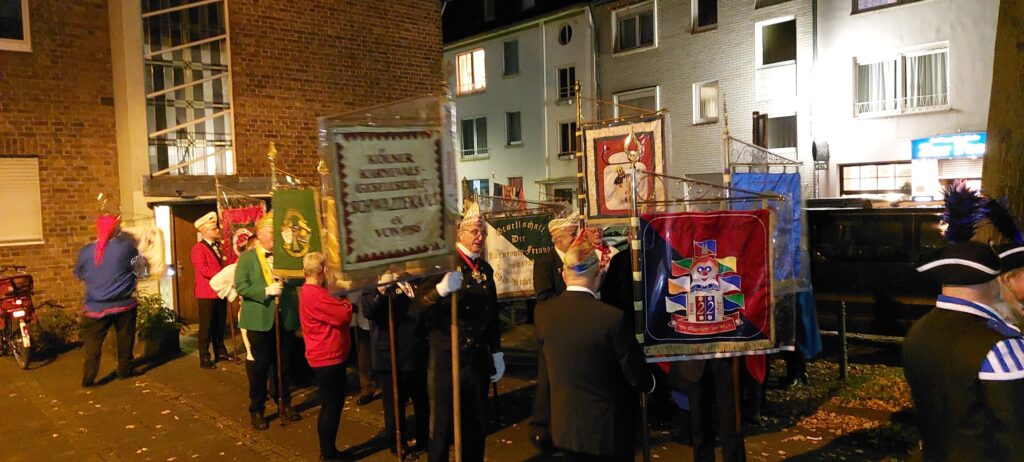unsere Gesellschaft hat zum ersten Mal eine eigene Standarte, die am 14.11. feierlich in der Liebfrauenkirche geweiht wurde. Über dreißig Standarten aus Köln, aber auch aus Krefeld Oppum und Aachen waren dabei vertreten und gaben der feierlichen Weihung einen würdigen Rahmen. In einem gemeinsamen kleinen Zug, unterstützt durch den Musikzug der Kölner Drachenhorde und vielen Gästen, ging es zur Kirche, der Musikzug spielte die Plaggen, unsere Gesellschaft und unsere Gäste ein.