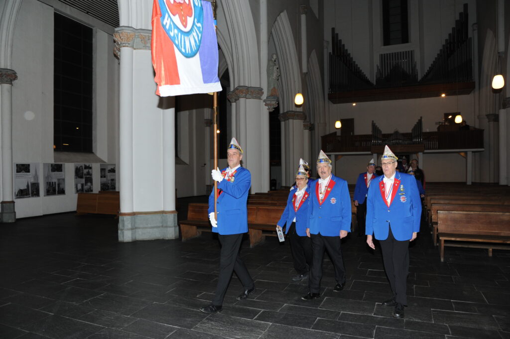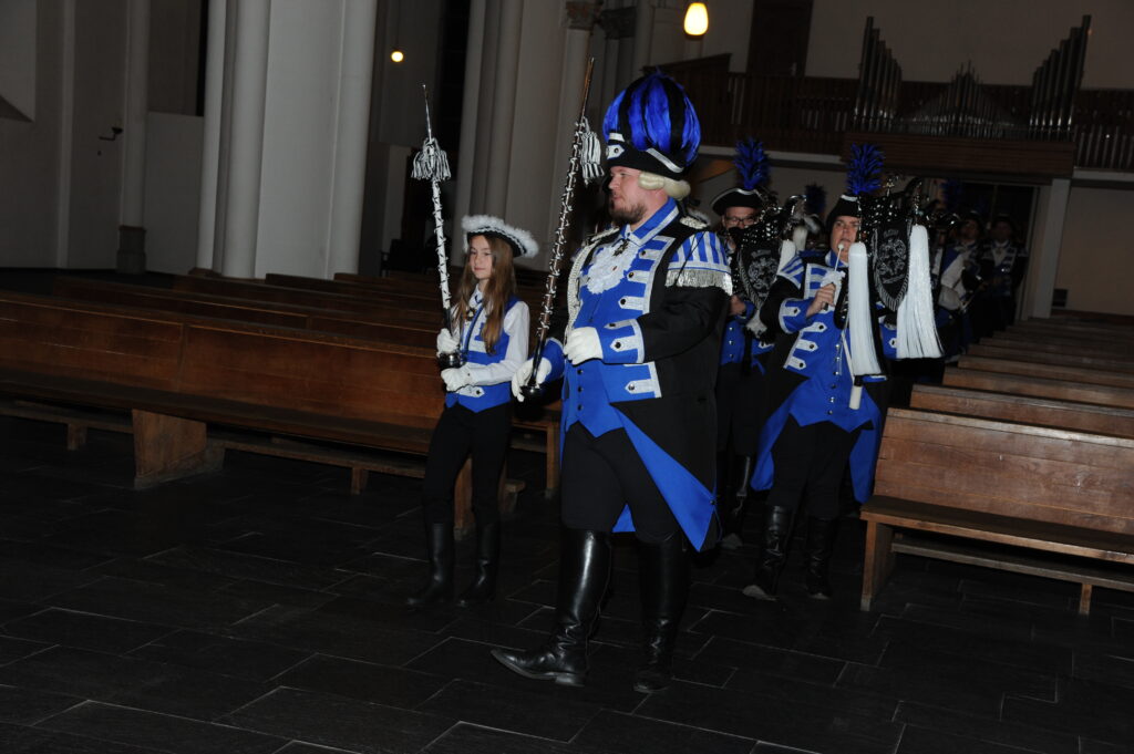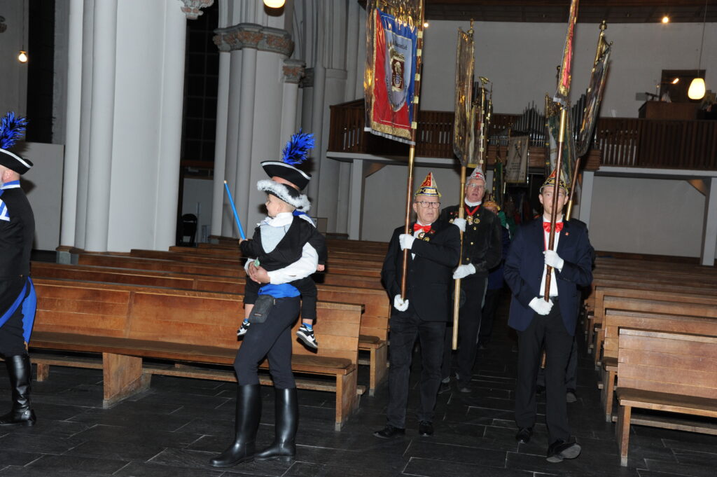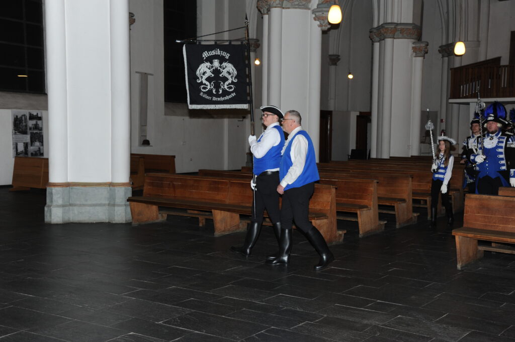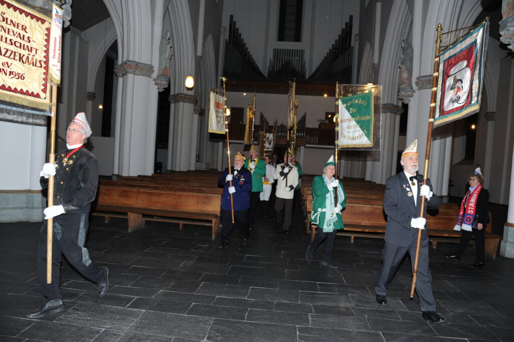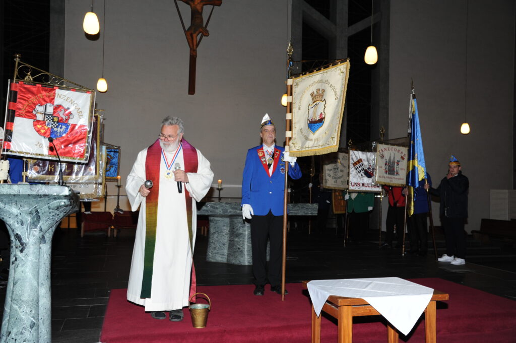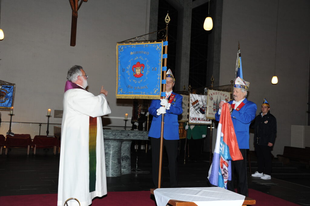 unsere Gesellschaft hat zum ersten Mal eine eigene Standarte, die am 14.11. feierlich in der Liebfrauenkirche geweiht wurde. Über dreißig Standarten aus Köln, aber auch aus Krefeld Oppum und Aachen waren dabei vertreten und gaben der feierlichen Weihung einen würdigen Rahmen. In einem gemeinsamen kleinen Zug, unterstützt durch den Musikzug der Kölner Drachenhorde und vielen Gästen, ging es zur Kirche, der Musikzug spielte die Plaggen, unsere Gesellschaft und unsere Gäste ein.