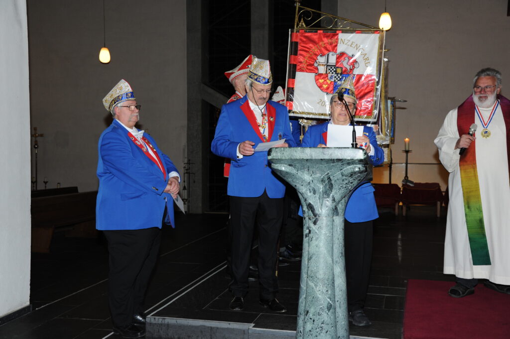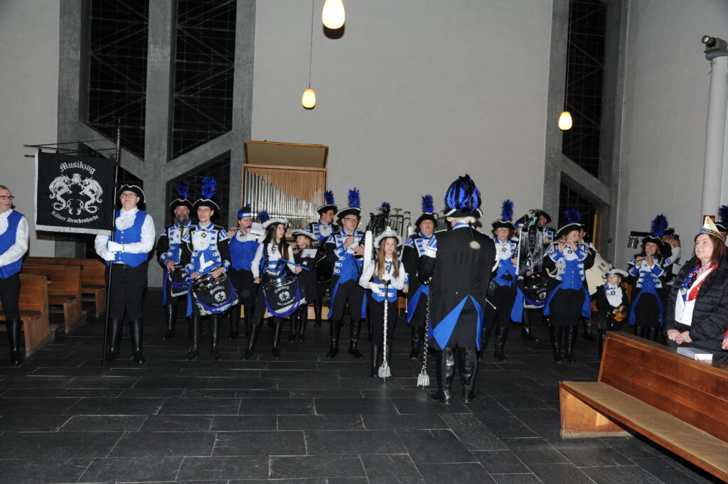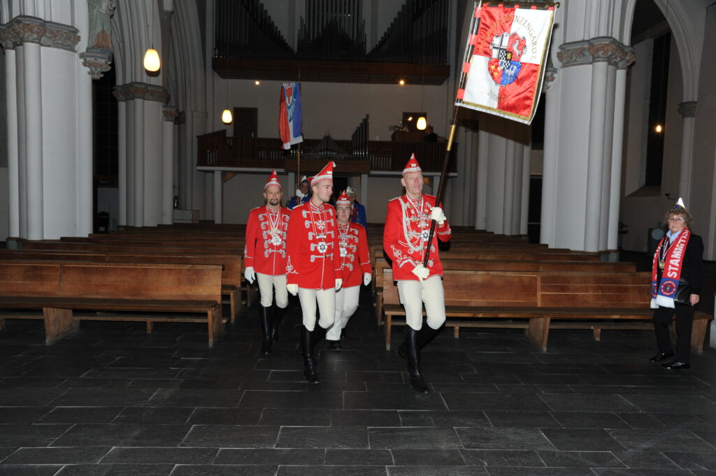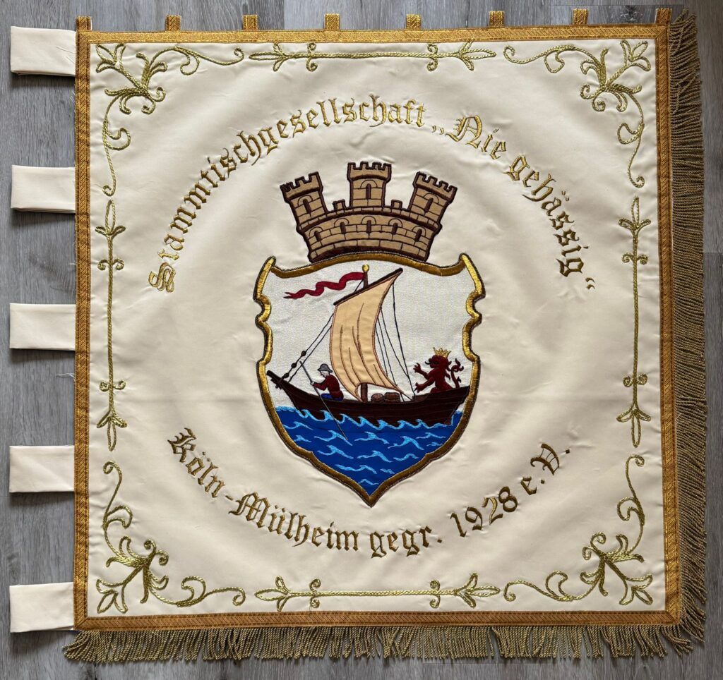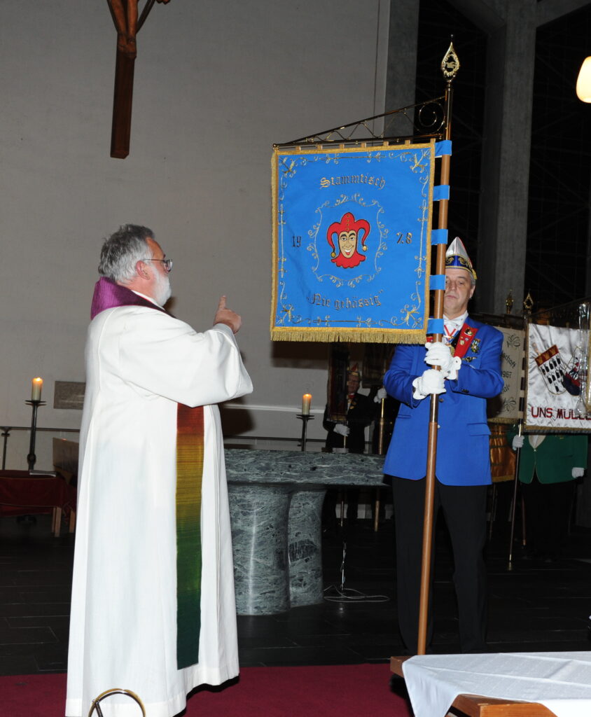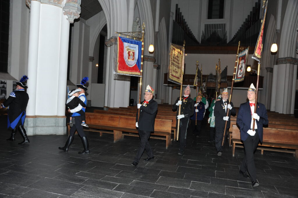 unsere Gesellschaft hat zum ersten Mal eine eigene Standarte, die am 14.11. feierlich in der Liebfrauenkirche geweiht wurde. Über dreißig Standarten aus Köln, aber auch aus Krefeld Oppum und Aachen waren dabei vertreten und gaben der feierlichen Weihung einen würdigen Rahmen. In einem gemeinsamen kleinen Zug, unterstützt durch den Musikzug der Kölner Drachenhorde und vielen Gästen, ging es zur Kirche, der Musikzug spielte die Plaggen, unsere Gesellschaft und unsere Gäste ein.